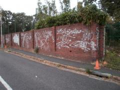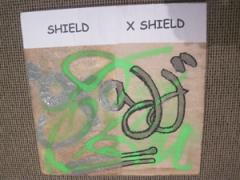 Graffiti SAC shield on sandstone tile, treatment on left part
