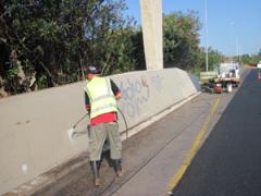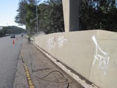 Graffiti Tags being removed from concrete road barrier walls by G.R.S